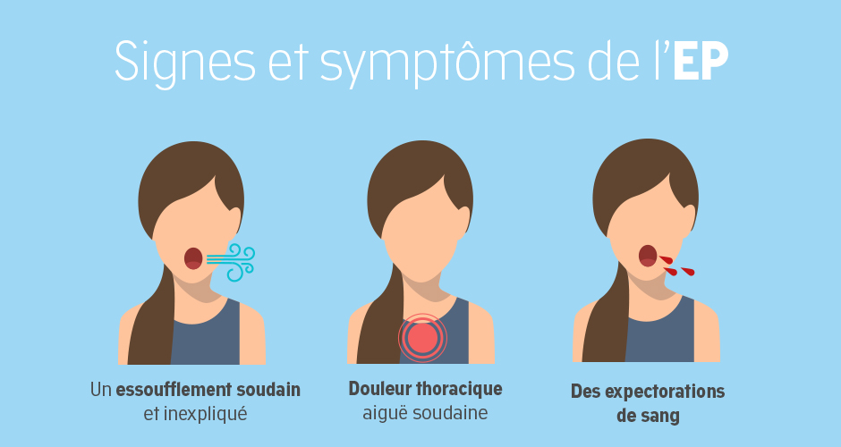 Les symptômes d’ pulmonaire () sont très différents. Surveillez l’apparition d’un essoufflement, d’une douleur dans la poitrine, d’une toux et d’étourdissements ou de battements de cœur irréguliers. Dans certains cas, les personnes atteintes d’ vont cracher du sang quand elles toussent.